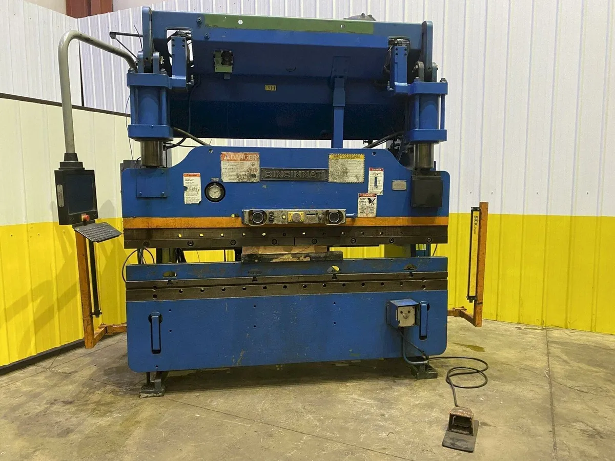 90 TON X 8' CINCINNATI MODEL 90FMx6 HYDRAULIC PRESS BRAKE 90 TON X 8' CINCINNATI MODEL 90FMx6 HYDRAULIC PRESS BRAKE Click images to enlarge Description 90 TON X 8' CINCINNATI MODEL 90FMx6 HYDRAULIC PRESS BRAKE: SERIAL: 43622 YEAR NEW_____ UPGRADED TOUCHSCREEN CONTROLS .... MODEL: 90FM X 6 CAPACITY: 90 TON OVERALL LENGTH OF BED AND RAM: 8' DISTANCE BETWEEN HOUSING: 6'6" STROKE OF RAM ____ " OPEN HEIGHT ____" CLOSED HEIGHT ____" RAM ADVANCE SPEED: 132 IPM RAM PRESSING SPEED: 18 IPM RAM RETURN SPEED: 190 IPM POWER BACK GAUGES _____" AUTO CROWNING: YES ELECTRIC FOOT TRIP: YES PEDESTAL STAND W/ PALM BUTTONS: YES MOTOR HP Thanks for Looking! I have a regular business selling used equipment. This item is also for sale outside of eBay therefore my listing will often end without notice. If you're interested please bid or make an offer promptly to avoid losing out. Buy with confidence. There is a 14 day return privilege if the item arrives not as described or non-functional unless otherwise stated in the description. Buyer must notify us within 14 days of items arrival. This is not a satisfaction guarantee, I will only honor a return if we miss-listed the items or it does not function properly. I try to take REALLY good photos so you know what you are bidding on. We want you to feel comfortable buying from us. If you have any questions please let us know. Images sell!Get Supersized Images & Free Image HostingCreate your brand with Auctiva'sCustomizable Templates.Attention Sellers - Get TemplatesImage Hosting, Scheduling at Auctiva.com.
