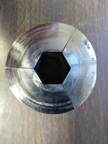 Hardinge S22 Collet Pad 15/16" Hexagon Smooth CNC Lathe. Check my other listings! I'm in the process of listing several hundred S22 Collet Pads. These will ship in a small flat rate USPS box unless you purchase enough for a medium box. These came to me in matched sets. The photos are for the exact pads you will be getting. Make: Hardinge Style: S22 Type: Collet Pad Size: 15/16 Inside: Smooth Segments: 3 INV #: P 116 Location: Bin 21