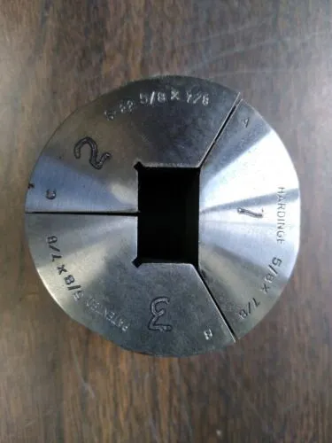 Hardinge S22 Collet Pad 5/8" x 7/8" Rectangle Smooth CNC Lathe. Check my other listings! I'm in the process of listing several hundred S22 Collet Pads. These will ship in a small flat rate USPS box unless you purchase enough for a medium box. These came to me in matched sets. The photos are for the exact pads you will be getting. Make: Hardinge Style: S22 Type: Collet Pad Size: 5/8 x 7/8 Inside: Smooth Segments: 3 INV#: P 151 Location: Bin 22