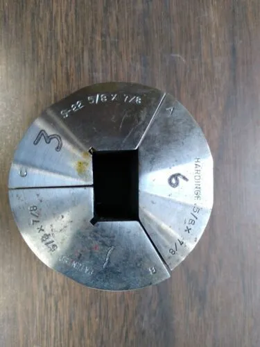Hardinge S22 Collet Pad 5/8" x 7/8" Rectangle Smooth CNC Lathe. Check my other listings! I'm in the process of listing several hundred S22 Collet Pads. These will ship in a small flat rate USPS box unless you purchase enough for a medium box. These came to me in matched sets. The photos are for the exact pads you will be getting. Make: Hardinge Style: S22 Type: Collet Pad Size: 5/8 x 7/8 Inside: Smooth Segments: 3 INV: P 168 Location: Bin 22