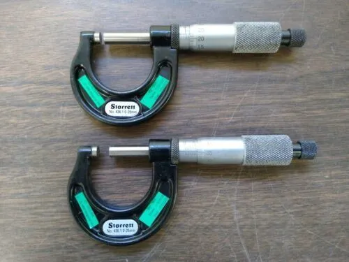 I am in the process of listing several hundred micrometers so please check my other items. These are all from the inspection office of a very large manufacturing company that closed last year. These were all in service. We will guarantee them to calibrate or return them within 30 days. Most of these will have some sort of engraving on them. Please check out the up close photos. 2 Starrett No 436 Ratcheting Stop Micrometer 0mm-25mm Make: Starrett Series: 436 Type: Micrometer Range: 0mm-25mm Spindle: Rotating Stop: Ratcheting INV#: M 34 Location: Rotomat 24