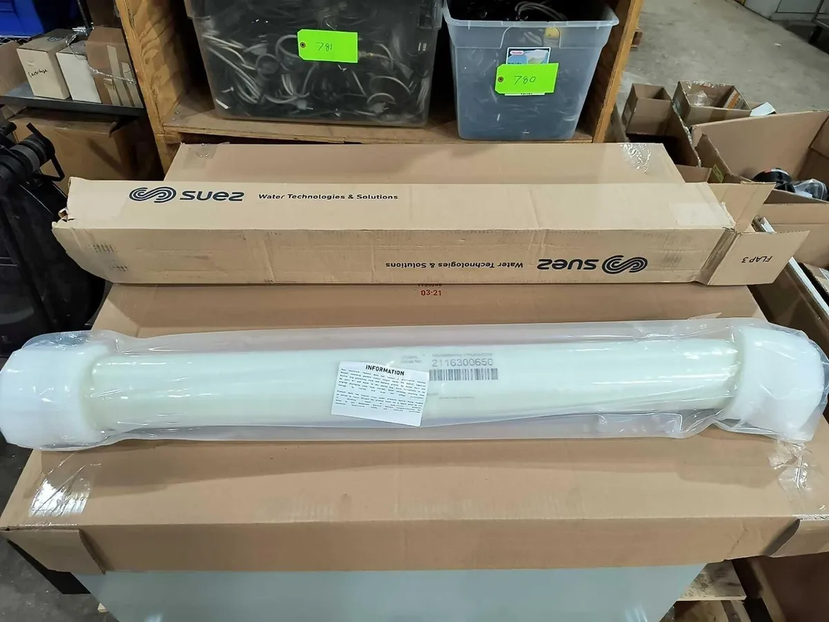 SUEZ Osmonics Desal AG4040FM 2200 GPD RO Membrane Element Fiberglass P/N 3039082 SUEZ Osmonics Desal AG4040FM 2200 GPD RO Membrane Element Fiberglass P/N 3039082 Click images to enlarge Description INV 5946 New in Box Suez Model AK4040FM Reverse Osmosis Membrane for Brackish Water Approximately 40" in Length and 4" in Diameter Manufacturer: Suez Model: AK4040FM P/N: 3039082 S/N: 2116300650 Type: Reverse Osmosis Membrane for Brackish Water Approximate Length: 40" Approximate Diameter: 4" Alternate Parts: 3032513, AG4040FM, 1206761 First Row Pallet Racking Above Bins Buy with confidence. There is a 14 day return privilege if the item arrives not as described or non-functional unless otherwise stated in the description. Buyer must notify us within 14 days of items arrival. This is not a satisfaction guarantee, I will only honor a return if we miss-listed the items or it does not function properly. I try to take REALLY good photos so you know what you are bidding on. We want you to feel comfortable buying from us. If you have any questions please let us know. Get images thatmake Supersized seem small.Showcase your items with Auctiva'sListing Templates!THE simple solution for eBay sellers.