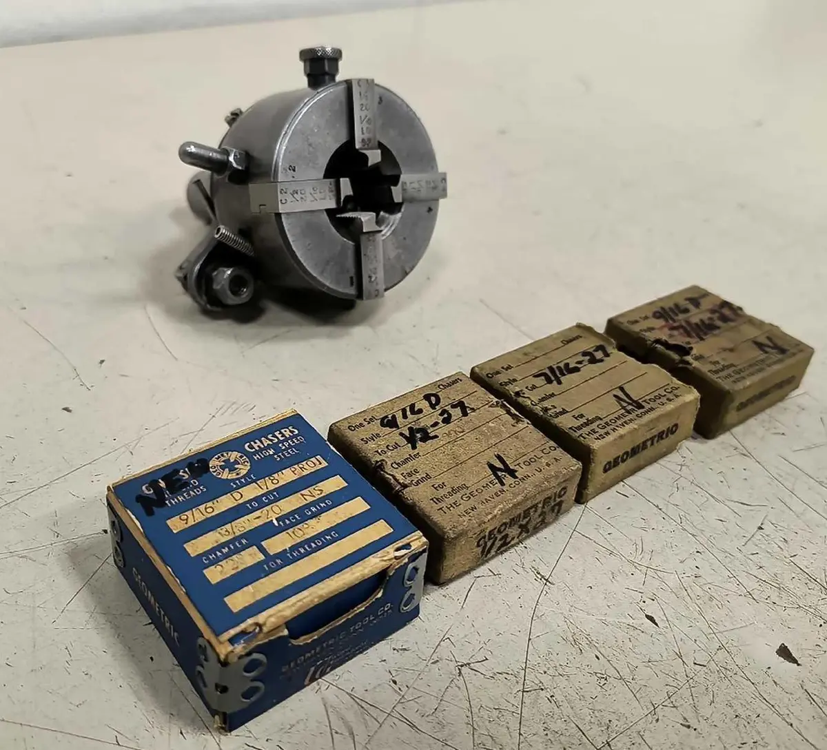 GEOMETRIC TOOL 9/16" GEOMETRIC DIE HEAD, 3/4" SHANK - STYLE DS - SIZE, CHASERS GEOMETRIC TOOL 9/16" GEOMETRIC DIE HEAD, 3/4" SHANK - STYLE DS - SIZE, CHASERS Click images to enlarge Description INV 6913 We are in the process of listing a lot of different die heads from a shop that was running Brown & Sharps but switched to CNC Swiss. Some of the thread chasers are used, please plan accordingly. We try to take a lot of photos so you know exactly what you are getting, please check them closely. We also have a ton of straight shank tooling. If you buy more than one lot please wait to pay until we can combine shipping. Thanks! Geometric Tool Company Geometric Die Head Style DS Size 9/16 3/4" Shank with (4) Sets of Thread Chasers Manufacturer: Geometric Style: DS Size: 9/16 S/N: 456202 Shank Diameter: 3/4" Head Diameter: 2-1/2" OAL: 3-1/2" Type: Geometric Die Head Rack B Thanks for Looking! I have a regular business selling used equipment. This item is also for sale outside of eBay therefore my listing will often end without notice. If you're interested please bid or make an offer promptly to avoid losing out. Buy with confidence. There is a 14 day return privilege if the item arrives not as described or non-functional unless otherwise stated in the description. Buyer must notify us within 14 days of items arrival. This is not a satisfaction guarantee, I will only honor a return if we miss-listed the items or it does not function properly. I try to take REALLY good photos so you know what you are bidding on. We want you to feel comfortable buying from us. If you have any questions please let us know. Pictures sell!Auctiva offers Free Image Hosting and Editing.300+ Listing Templates!Auctiva gets you noticed!The complete eBay Selling Solution.