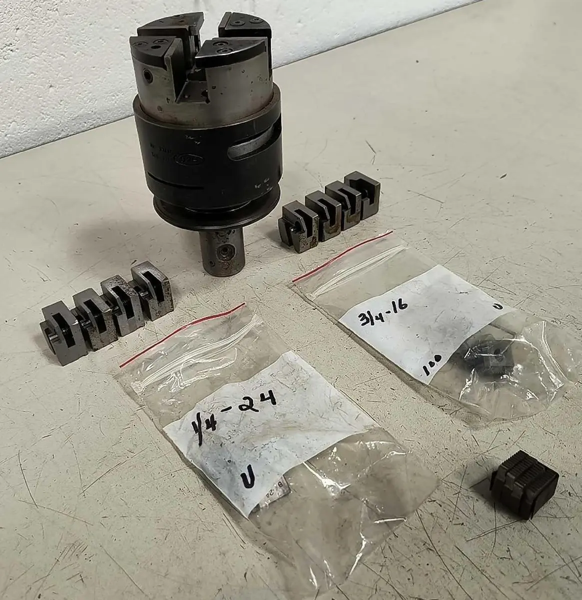 H&G GEOMETRIC DIE HEAD - 1" SHANK - STYLE MM - SIZE 101, Chasers, Blocks H&G GEOMETRIC DIE HEAD - 1" SHANK - STYLE MM - SIZE 101, Chasers, Blocks Click images to enlarge Description INV 6879 We are in the process of listing a lot of different die heads from a shop that was running Brown & Sharps but switched to CNC Swiss. Some of the thread chasers are used, please plan accordingly. We try to take a lot of photos so you know exactly what you are getting, please check them closely. We also have a ton of straight shank tooling. If you buy more than one lot please wait to pay until we can combine shipping. Thanks! H&G Geometric Die Head Style MM Size 101 with (8) Chaser Blocks and Assortment of Thread Chasers 1" Shank Manufacturer: H&G Style: MM Size: 101 Head Diameter: 2-1/2" Shank Diameter: 1" OAL: 5-1/4" Chaser Blocks: (8) 17/32 - 3/4 Rack L Thanks for Looking! I have a regular business selling used equipment. This item is also for sale outside of eBay therefore my listing will often end without notice. If you're interested please bid or make an offer promptly to avoid losing out. Buy with confidence. There is a 14 day return privilege if the item arrives not as described or non-functional unless otherwise stated in the description. Buyer must notify us within 14 days of items arrival. This is not a satisfaction guarantee, I will only honor a return if we miss-listed the items or it does not function properly. I try to take REALLY good photos so you know what you are bidding on. We want you to feel comfortable buying from us. If you have any questions please let us know. Get images thatmake Supersized seem small.Showcase your items with Auctiva'sListing Templates!THE simple solution for eBay sellers.