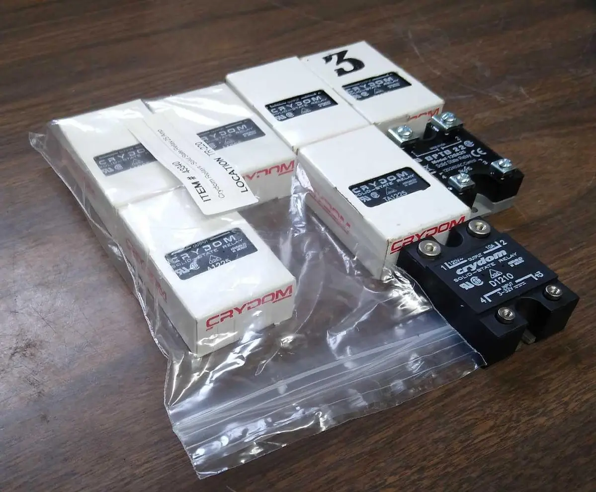 (7) Crydom Solid State Relay A1225 D1225 TA1225 D1210 (1) OPTO 120A25 Relays (7) Crydom Solid State Relay A1225 D1225 TA1225 D1210 (1) OPTO 120A25 Relays Click images to enlarge Description INV 5148 I don't believe any of these have been used but (2) are out of their boxes. Surplus shelf pull from supply room of a big corporation. (4) A1225 Crydom Solid State Relay (1) D1225 Crydom Solid State Relay (1) TA1225 Crydom Solid State Relay (1) D1210 Crydom Solid State Relay (No Box or hardware) (1) 120A25 OPTO Solid State Relay (No Box) Rack I Buy with confidence. There is a 14 day return privilege if the item arrives not as described or non-functional unless otherwise stated in the description. Buyer must notify us within 14 days of items arrival. This is not a satisfaction guarantee, I will only honor a return if we miss-listed the items or it does not function properly. I try to take REALLY good photos so you know what you are bidding on. We want you to feel comfortable buying from us. If you have any questions please let us know. Get images thatmake Supersized seem small.Showcase your items with Auctiva'sListing Templates!THE simple solution for eBay sellers.