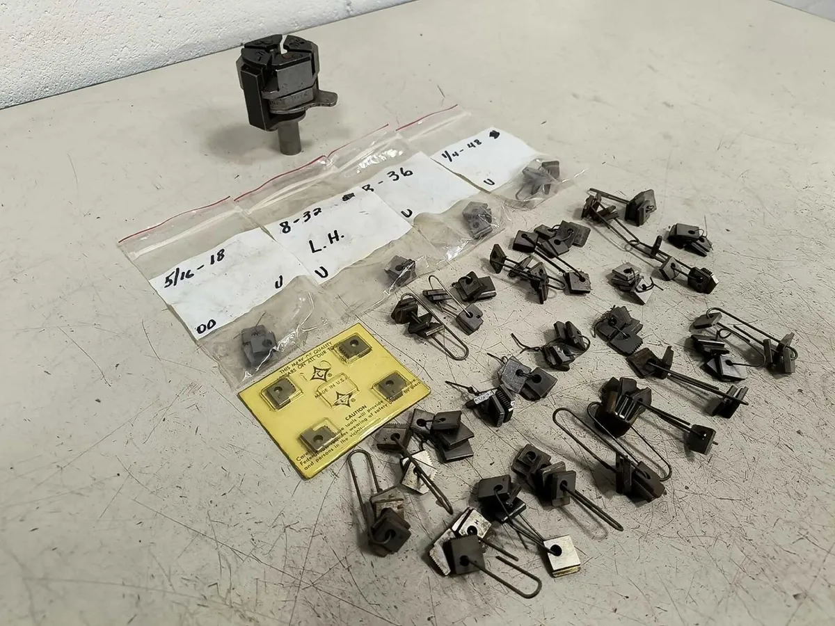 CLEVELAND GEOMETRIC DIE HEAD - 5/8" SHANK - STYLE DMLN - SIZE 00, Chasers CLEVELAND GEOMETRIC DIE HEAD - 5/8" SHANK - STYLE DMLN - SIZE 00, Chasers Click images to enlarge Description INV 6891 We are in the process of listing a lot of different die heads from a shop that was running Brown & Sharps but switched to CNC Swiss. Some of the thread chasers are used, please plan accordingly. We try to take a lot of photos so you know exactly what you are getting, please check them closely. We also have a ton of straight shank tooling. If you buy more than one lot please wait to pay until we can combine shipping. Thanks! Cleveland Geometric Die Head Style DMLN Size 00 with Large Assortment of Thread Chasers 5/8" Shank Manufacturer: Cleveland Style: DMLN Size: 00 S/N: 9884 Head Diameter: 2" Shank Diameter: 5/8" OAL: 3" Rack L Thanks for Looking! I have a regular business selling used equipment. This item is also for sale outside of eBay therefore my listing will often end without notice. If you're interested please bid or make an offer promptly to avoid losing out. Buy with confidence. There is a 14 day return privilege if the item arrives not as described or non-functional unless otherwise stated in the description. Buyer must notify us within 14 days of items arrival. This is not a satisfaction guarantee, I will only honor a return if we miss-listed the items or it does not function properly. I try to take REALLY good photos so you know what you are bidding on. We want you to feel comfortable buying from us. If you have any questions please let us know. Images sell!Get Supersized Images & Free Image HostingCreate your brand with Auctiva'sCustomizable Templates.Attention Sellers - Get TemplatesImage Hosting, Scheduling at Auctiva.com.