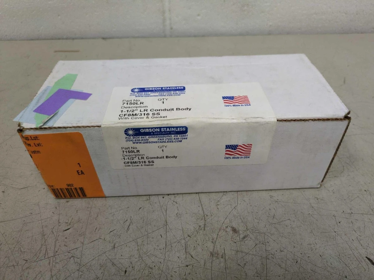 Sealed Box Gibson Stainless 7150LR 1-1/2 Conduit LR Body CF8M 316SS Cover Gasket Sealed Box Gibson Stainless 7150LR 1-1/2 Conduit LR Body CF8M 316SS Cover Gasket Click images to enlarge Description INV 7852 New in Factory Sealed Box Gibson Stainless 7150LR 1-1/2" Conduit LR Body CF8M/316SS with Cover and Gasket Make: Gibson Stainless Model: 7150LR Type: Conduit LR Body Size: 1-1/2" Material: CF8M/316SS Design: LR Style: Form 8 Material: -Body: CF8M (316 SS) -Cover and Screws: 316 SS -Gasket: Neoprene Compliances: UL Listed for Canada and US (Standard 514A) UL File Number QCIT.E300676 Canada UL File Number DWTT7.E300676 Suitable for wet locations. 100% Made in USA Weight: 4 lbs 10 oz Dimensions: 9-3/4" x 4-1/4" x 3-1/2" Bin 5 Thanks for Looking! I have a regular business selling used equipment. This item is also for sale outside of eBay therefore my listing will often end without notice. If you're interested please bid or make an offer promptly to avoid losing out. Buy with confidence. There is a 14 day return privilege if the item arrives not as described or non-functional unless otherwise stated in the description. Buyer must notify us within 14 days of items arrival. This is not a satisfaction guarantee, I will only honor a return if we miss-listed the items or it does not function properly. I try to take REALLY good photos so you know what you are bidding on. We want you to feel comfortable buying from us. If you have any questions please let us know. Get images thatmake Supersized seem small.Showcase your items with Auctiva'sListing Templates!THE simple solution for eBay sellers.
