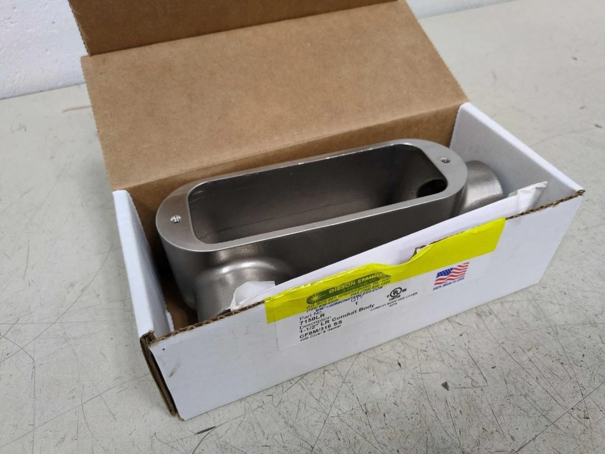 NIB Gibson Stainless 7150LR 1-1/2 Conduit LR Body CF8M 316SS Cover Gasket NIB Gibson Stainless 7150LR 1-1/2 Conduit LR Body CF8M 316SS Cover Gasket Click images to enlarge Description INV 7853 New in Factory Sealed Box Gibson Stainless 7150LR 1-1/2" Conduit LR Body CF8M/316SS with Cover and Gasket Make: Gibson Stainless Model: 7150LR Type: Conduit LR Body Size: 1-1/2" Material: CF8M/316SS Design: LR Style: Form 8 Material: -Body: CF8M (316 SS) -Cover and Screws: 316 SS -Gasket: Neoprene Compliances: UL Listed for Canada and US (Standard 514A) UL File Number QCIT.E300676 Canada UL File Number DWTT7.E300676 Suitable for wet locations. 100% Made in USA Weight: 4 lbs 10 oz Dimensions: 9-3/4" x 4-1/4" x 3-1/2" Get images thatmake Supersized seem small.Showcase your items with Auctiva'sListing Templates!THE simple solution for eBay sellers.