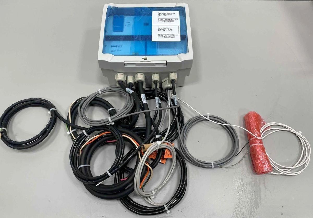 NOS Burkert Type 8620 myCONTROL Multifunctional Controller, Water Treatment NOS Burkert Type 8620 myCONTROL Multifunctional Controller, Water Treatment Click images to enlarge Description INV 3906 These controllers are New Old Stock from a project that has been discontinued. These are currently configured for that project but can likely be modified to other uses by reprogramming it with an SD card or USB interface. These are new in the box. Never used. These can be sent FedEx or DHL. International Shipping is Available. Make: Burkert Model: 8620 myCONTROL Type: Multifunctional Controller Serial Number: varies (we have multiple units) Electrics: 100-240 Volt, 50/60 hz, max 10A SD Card and Keys included Manual available online and can be downloaded Cords are labeled as follows: P-1701 CIP Pump (3-wire power cord) FV-0902 Feed Flush Solenoid (3-wire power cord) R-0901 RO High Pump (5-wire power cord) PS-0901 RO Inlet Press Switch (2-wire w/ ground) PS-0902 RO High Conc Pressure Switch (2-wire w/ ground) PS-0903 RO Perm Press Switch (2-wire w/ ground) FV-0901 RO Inlet SO Valve (3-wire power cord) FE-0901 RO Conc Flow Paddle Wheel (Sensor) FE-0902 RO Perm Flow Paddle Wheel (Sensor) TE-0901 RO Perm Temp (Sensor) AIT-0902 RO Perm Cond Trans (2-wire w/ ground) AIT-0904 RO Inlet PH Trans (2-wire w/ ground) The mxCONTROL multifunction controller, is a microprocessor controller designed to automate the control of process variables within a water treatment system (e.g. boiler, cooling tower or Reverse Osmosis system). Sophisticated electronics and state of the art control algorithms ensure that optimum process control is maintained at all times, with minimal operator intervention. The controller is capable of processing numerous combinations of analog and digital in- and outputs. Combined with an easy to read large graphic display backlight in three languages, F, G, E. Other languages on demand. The controller is highly software based. It can easily be configured/parameterized using a PC tool and SD card or USB interface. Alternatively, the optional Ethernet interface can be used to configure and to parameterize the controller. Local manual parameterizing of the controller can also be achieved via the five soft-touch keys. The controller is delivered with the SD Card containing sample configuration fi les and Instruction Manuals. There are 3 levels of Man-machine interface. Open access, Operator Only Access, Specialist Access. Data and event logging One controller hardware with dozens of configuration possibilities quickly downloaded via SD card (supplied) or via USB interface. Ethernet or modem communication with email or call event notification & numerous input/output control signals Pallet Racking Main North Side Middle Thanks for Looking! I have a regular business selling used equipment. This item is also for sale outside of eBay therefore my listing will often end without notice. If you're interested please bid or make an offer promptly to avoid losing out. Buy with confidence. There is a 14 day return privilege if the item arrives not as described or non-functional unless otherwise stated in the description. Buyer must notify us within 14 days of items arrival. This is not a satisfaction guarantee, I will only honor a return if we miss-listed the items or it does not function properly. I try to take REALLY good photos so you know what you are bidding on. We want you to feel comfortable buying from us. If you have any questions please let us know. Get images thatmake Supersized seem small.Showcase your items with Auctiva'sListing Templates!THE simple solution for eBay sellers.