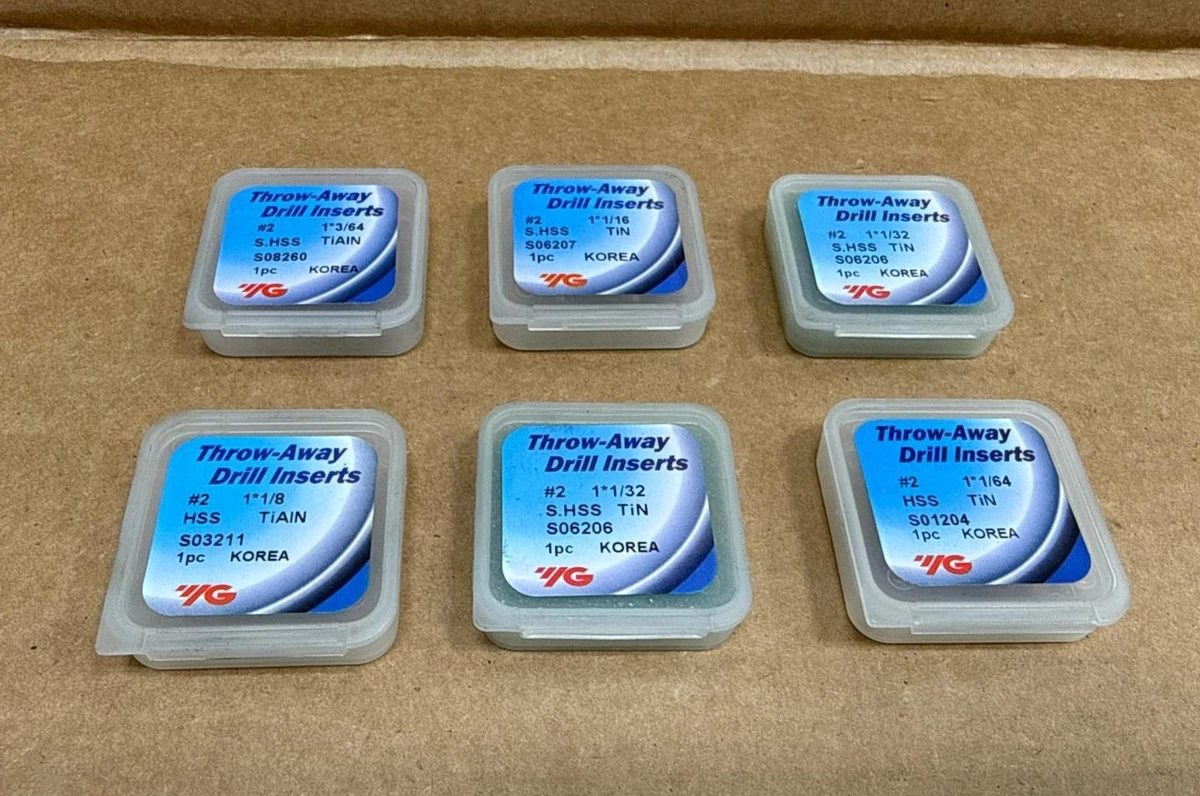 (6) YG-1 #2 Throw Away Inserts, S06206, 1-1/64 to 1-1/8? , HSS, TiN (6) YG-1 #2 Throw Away Inserts, S06206, 1-1/64 to 1-1/8? , HSS, TiN Click images to enlarge Description INV 8700 (6) New Boxes YG-1 Throw-Away Drill Inserts Qty-1, #2, S08260, 1-3/64", S.HSS, TiAIN Qty-1, #2, S06207, 1-1/16", S.HSS, TiN Qty-1, #2, S06206, 1-1/32", S.HSS, TiN Qty-1, #2, S06206, 1-1/32", S.HSS, TiN Qty-1, #2, S03211, 1-1/8", S.HSS, TiN Qty-1, #2, S01204, 1-1/64", S.HSS, TiN H5 Roto Returns All refund requests must be initiated within 30 Days of Date of Receipt. Transactions outside of 30 Days are not eligible for refunds. We offer refunds for items which are Not as Described or Non Functional. Items must be received back for inspection prior to refund. Buyer is responsible for shipping both ways if the return is for a reason other than not as described or nonfunctional. Items sold as "New" or "New (Other)" or with a factory sealed box must be received back in original condition including all packaging with intact factory seals to qualify for a refund. Removing an item from manufacturer's packaging, or tampering with Factory Seals disqualifies the item from a refund. Shipping For most items under 120 pounds we offer FedEx shipping. Small items will often be sent USPS. We are happy to combine items when purchased on the same day. The final shipping costs will depend on the combined weight & dimension. We can generally ship overnight or expedited with FedEx or UPS. Our daily cutoff for overnight shipping is 1:00 CST. If an item is to be shipped via freight please contact us for a shipping quote. You can also arrange your own freight. Depending on the item we will charge $50-$150 to palletize and shrink wrap your item for shipping. Crating is an additional charge. Buyer responsible for sending us a BOL prior to loading if they are arranging shipping. International buyers are responsible for all import duties, taxes and charges. If an international package is returned the buyer is responsible for paying shipping a second time. Thanks for Looking! I have a regular business selling used equipment. This item is also for sale outside of eBay therefore my listing will often end without notice. If you're interested please bid or make an offer promptly to avoid losing out. Buy with confidence. There is a 14 day return privilege if the item arrives not as described or non-functional unless otherwise stated in the description. Buyer must notify us within 14 days of items arrival. This is not a satisfaction guarantee, I will only honor a return if we miss-listed the items or it does not function properly. I try to take REALLY good photos so you know what you are bidding on. We want you to feel comfortable buying from us. If you have any questions please let us know. Pictures sell!Auctiva offers Free Image Hosting and Editing.300+ Listing Templates!Auctiva gets you noticed!The complete eBay Selling Solution.